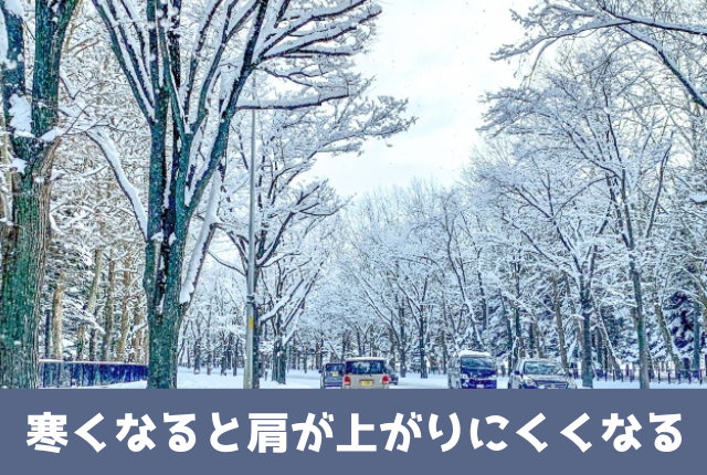 3年前からなのですが、冬に入る頃になるとふとしたこと (例えば物を取ろうと手をひねるなど)から 肩の筋がおかしくなって、そのまま固まったように可動範囲が狭くなり (特に手を上げることが難しくなる)、かつ動かす時に痛みも感じます。